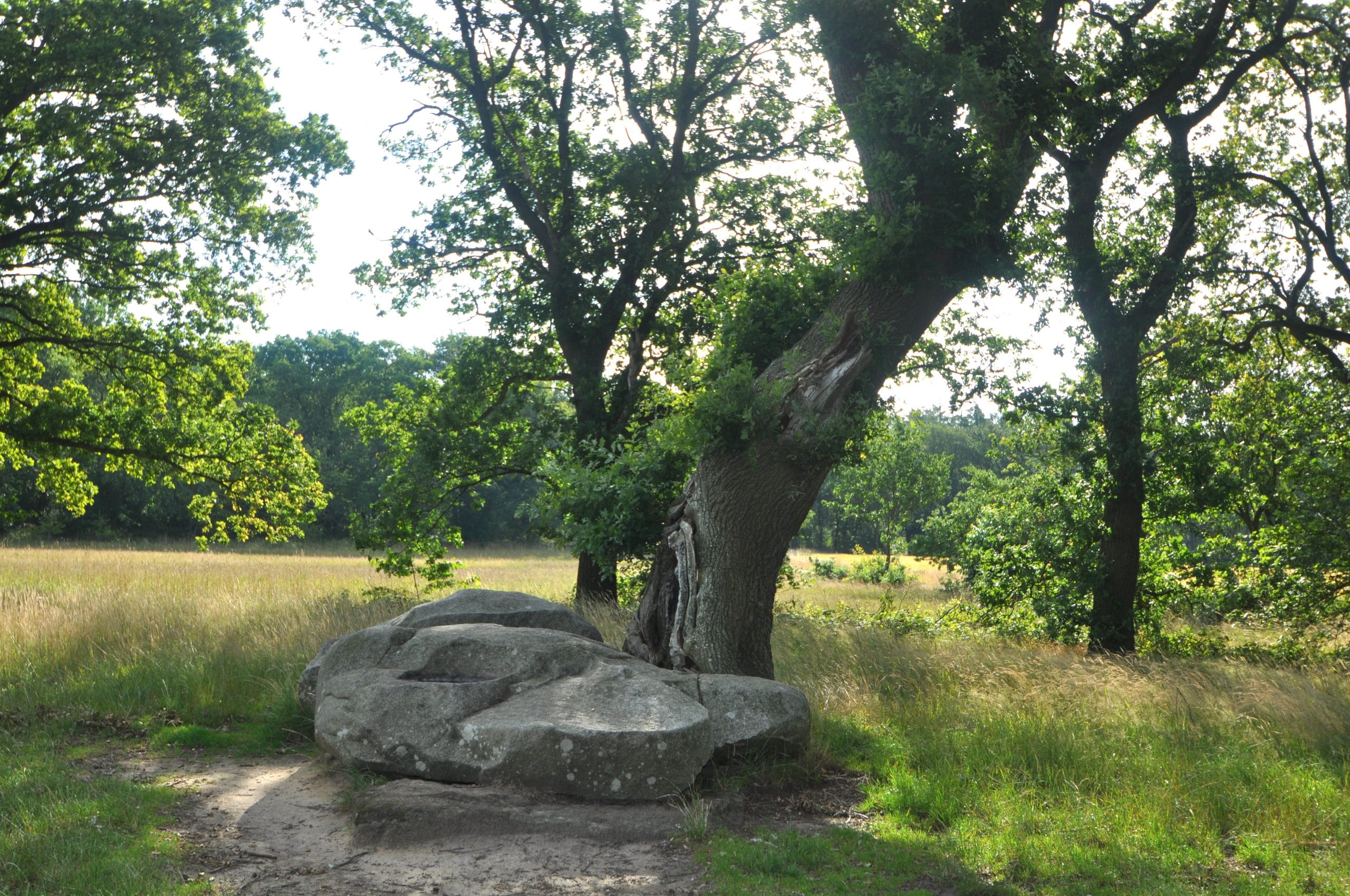 Wat deze hunebed extra bijzonder maakt, is de unieke plaatsing tegen de majestueuze boom. Deze symbiose tussen menselijke creatie en de natuurlijke wereld creëert een harmonieus tafereel. Het ruwe gesteente contrasteert prachtig met de organische vormen van de boom, waardoor een betoverende omgeving ontstaat die uitnodigt tot contemplatie.